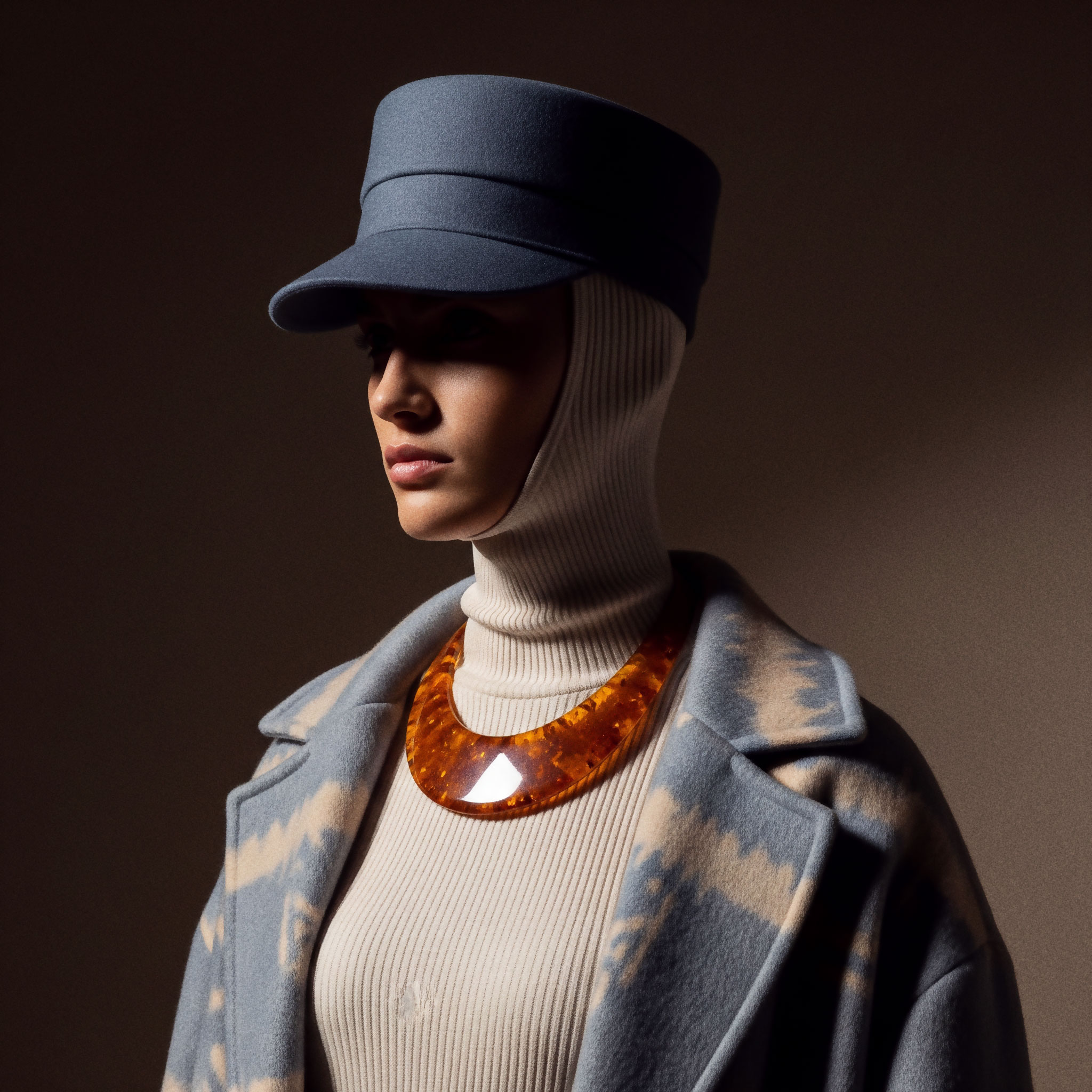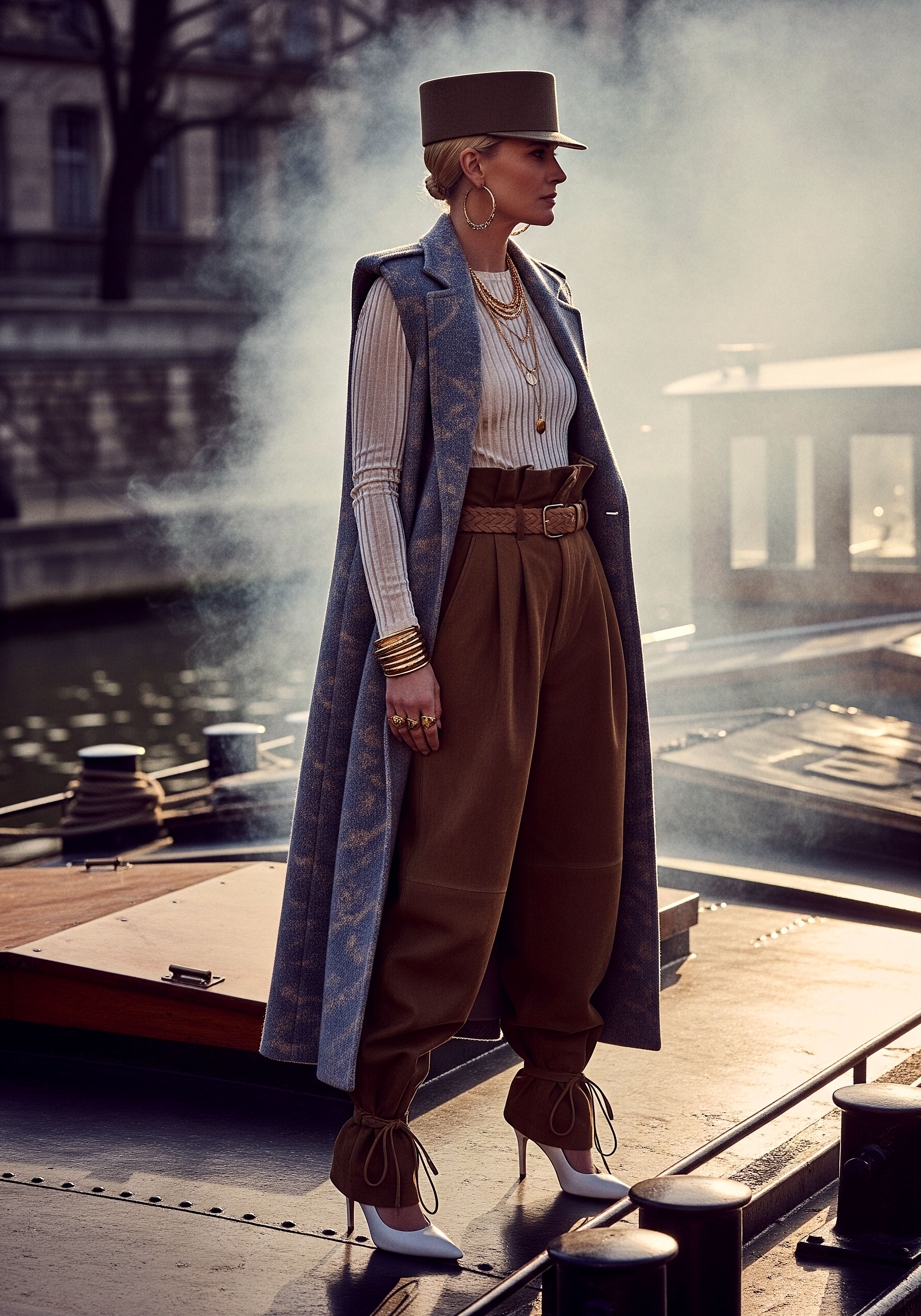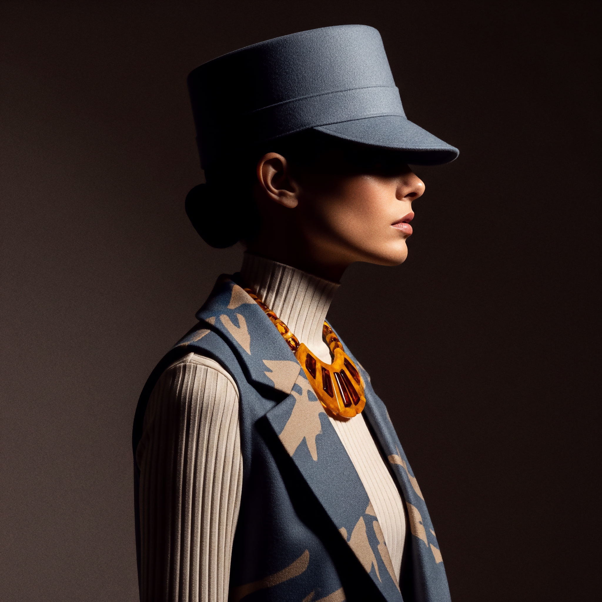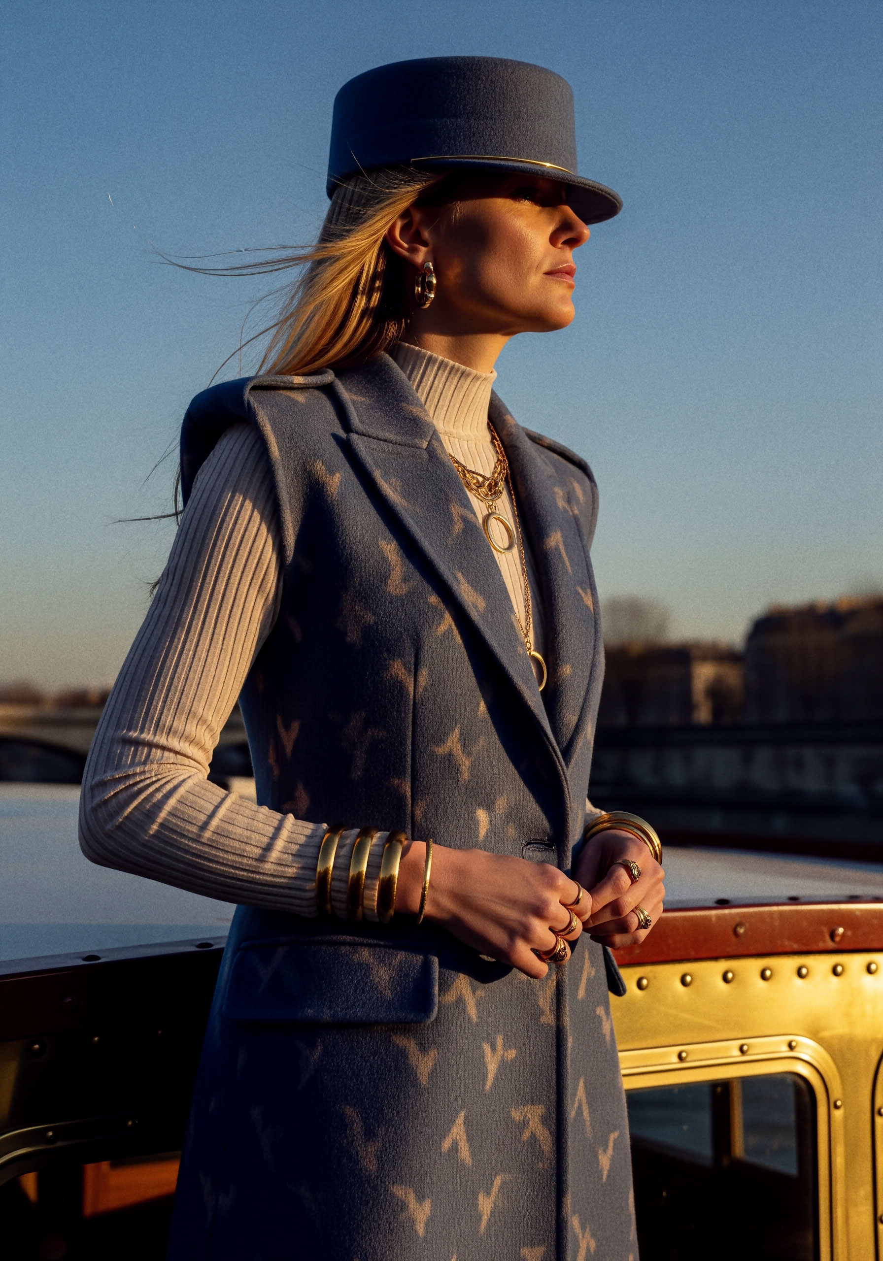 Jewelry completes what fabric begins. It frames, underlines, and refines. The sleeveless coat and kepi reinforce structure, elevating the silhouette into something ceremonial, almost regimental.