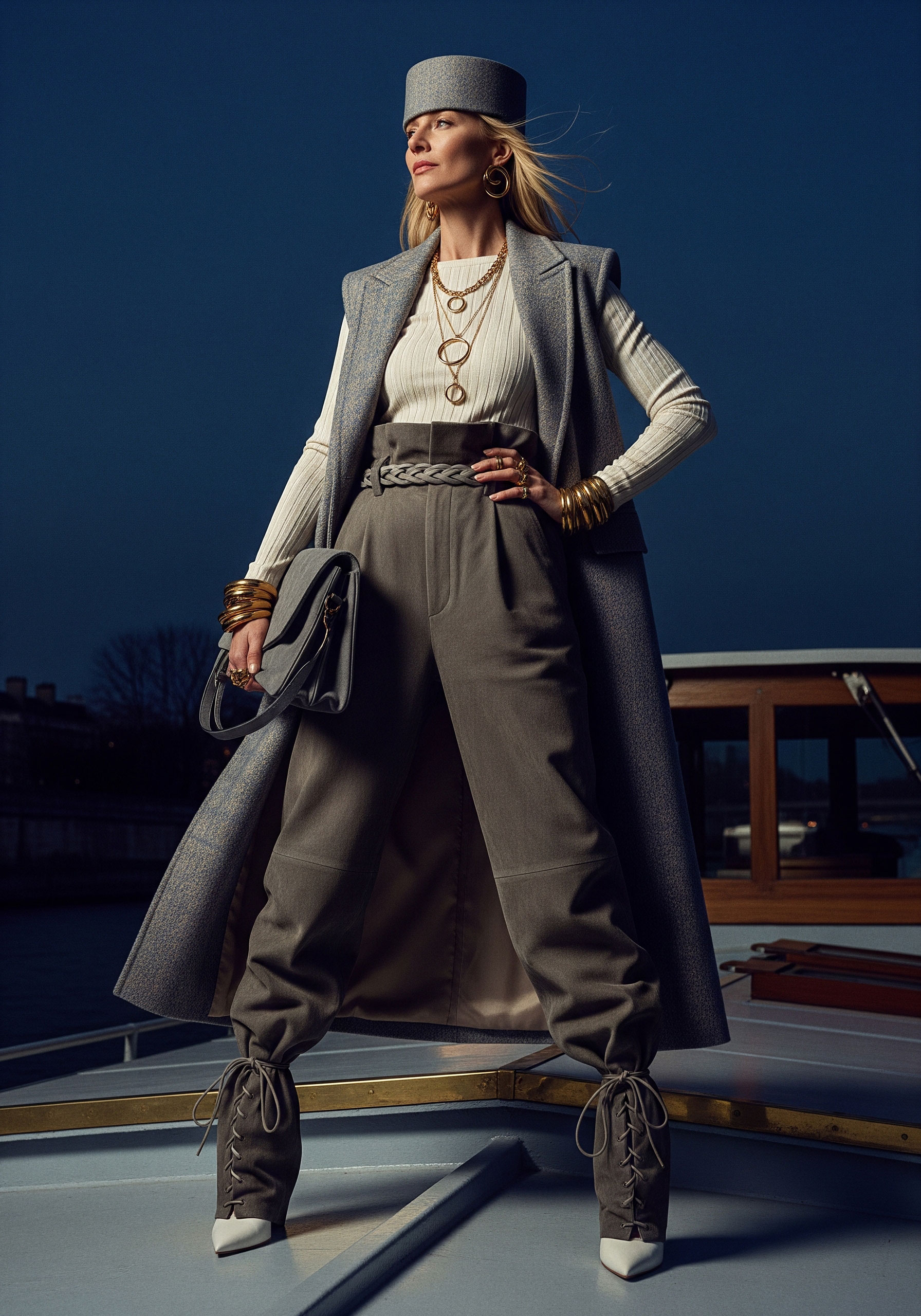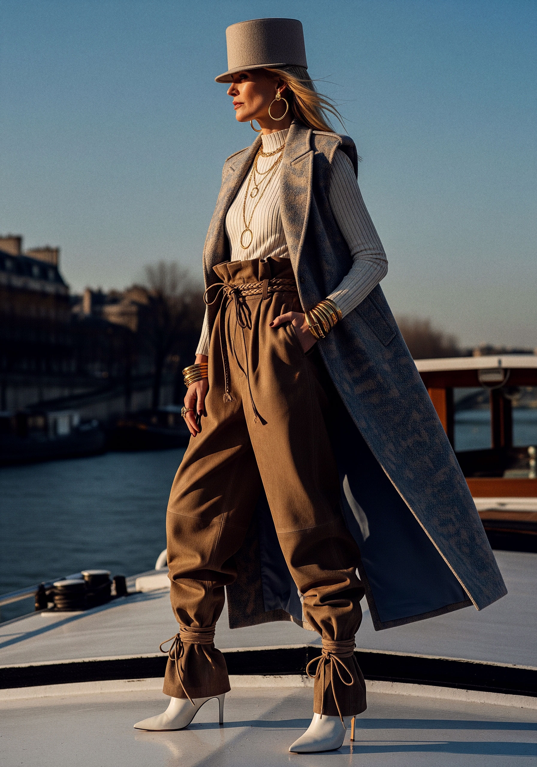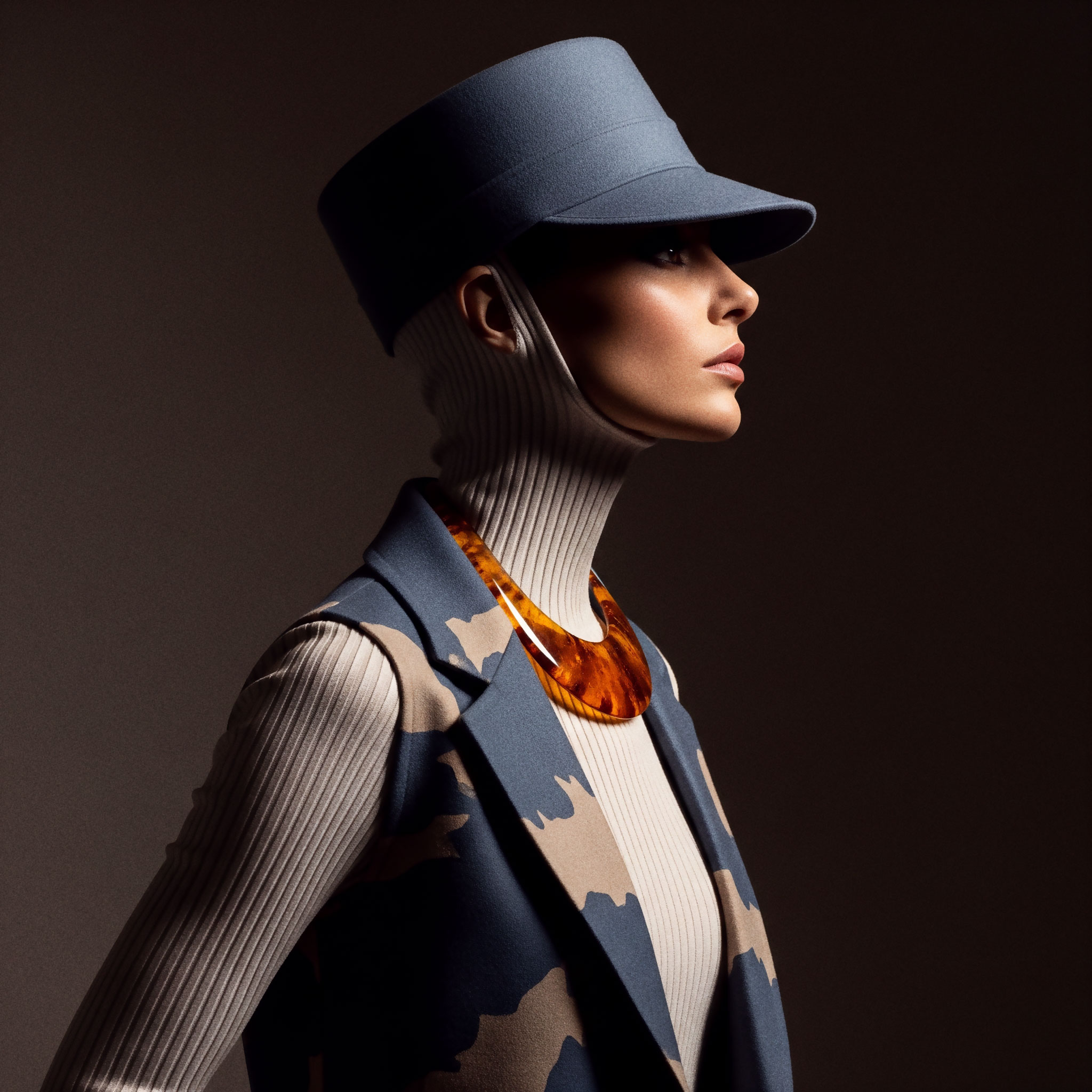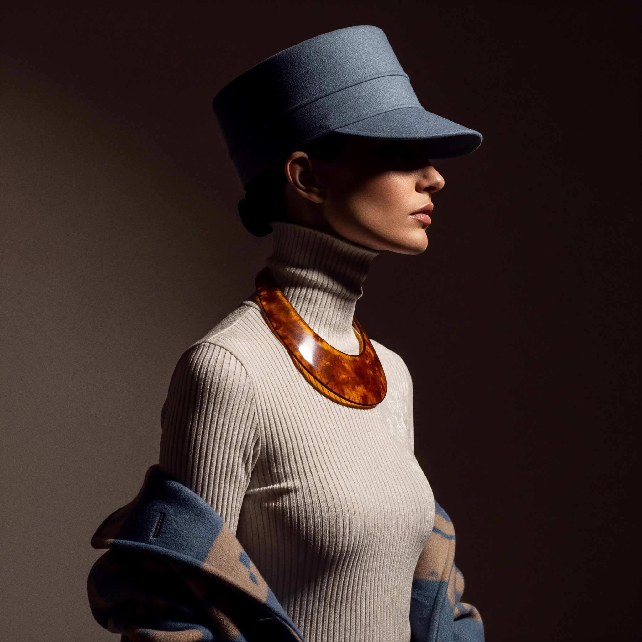 Jewelry completes what fabric begins. It frames, underlines, and refines. The sleeveless coat and kepi reinforce structure, elevating the silhouette into something ceremonial, almost regimental.