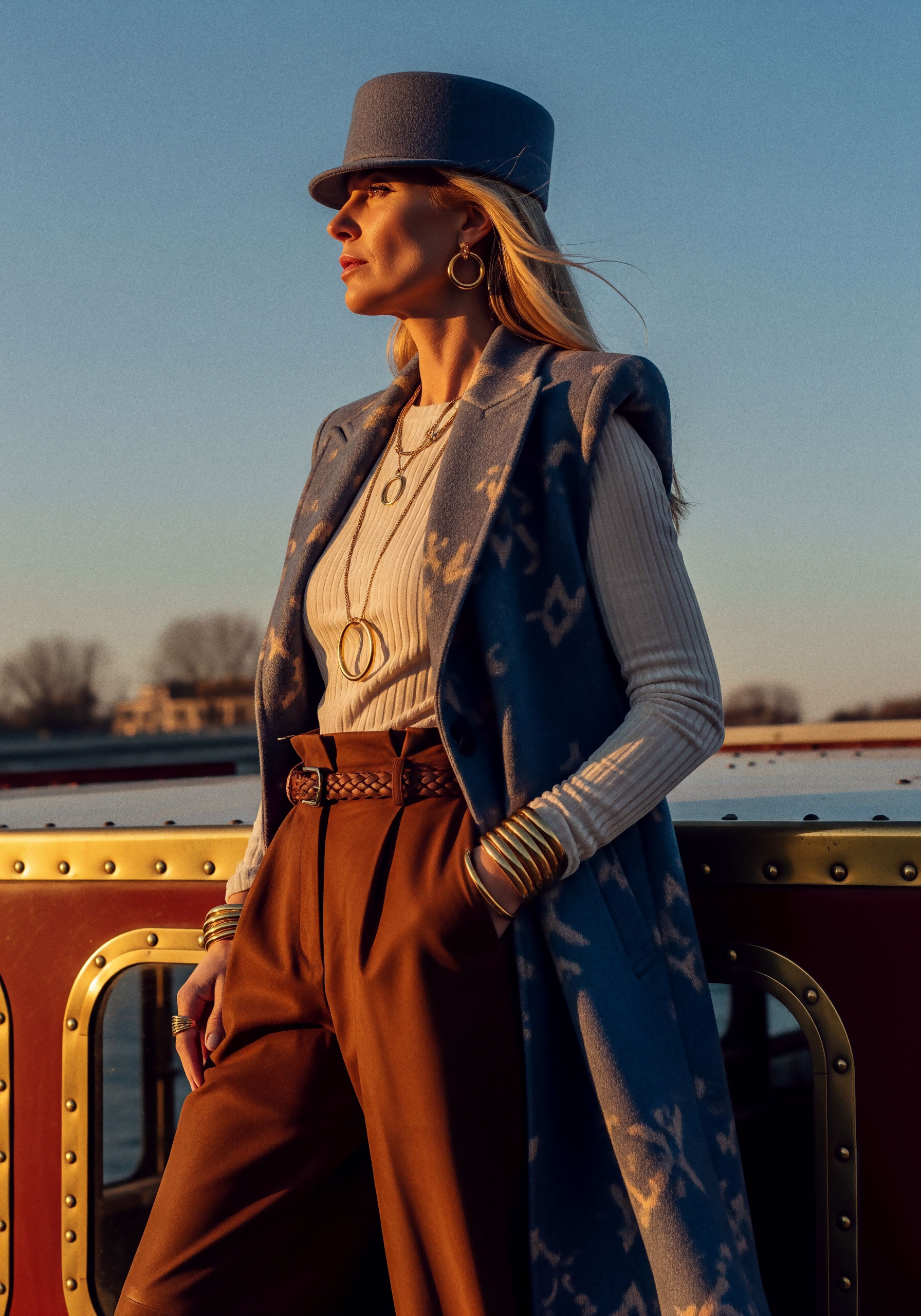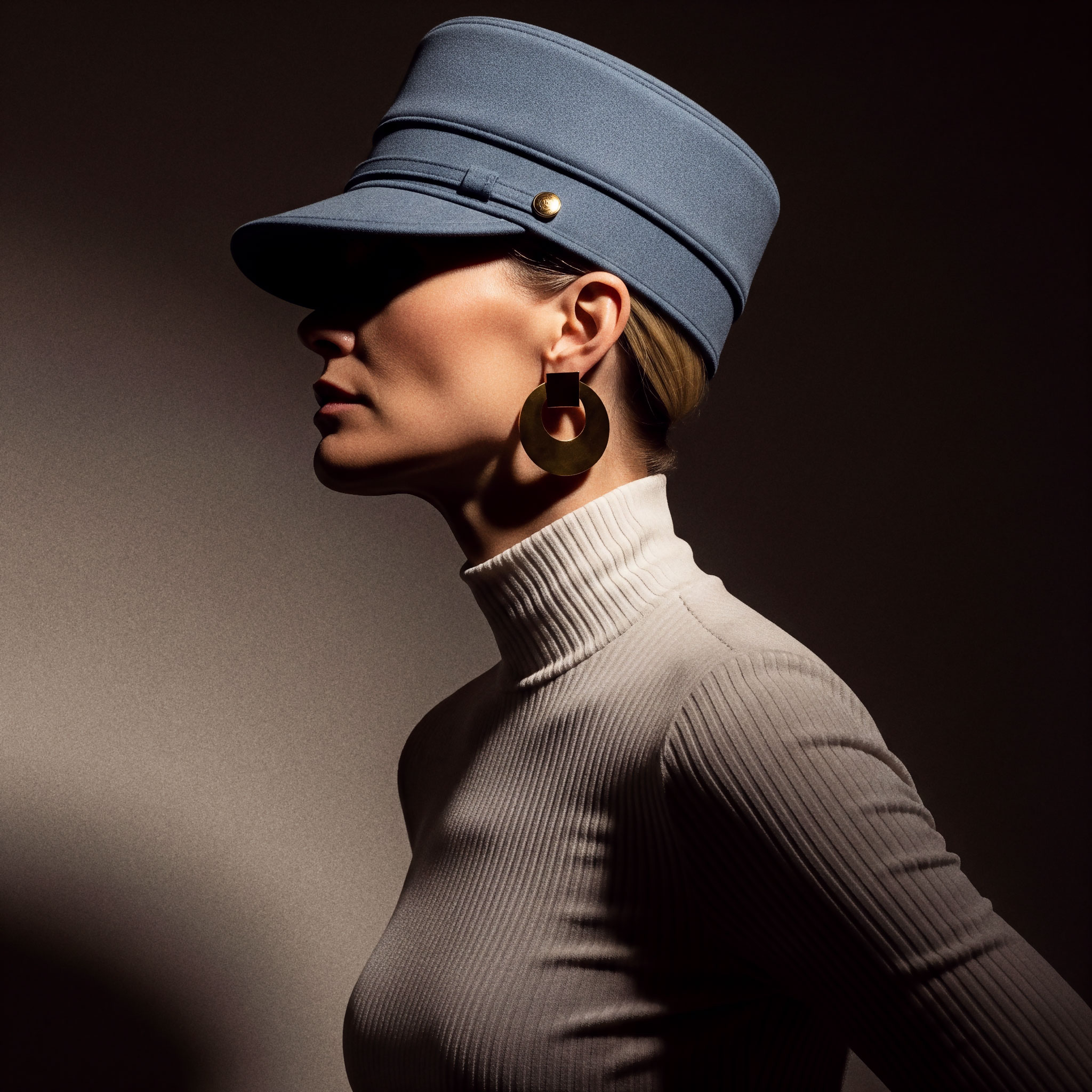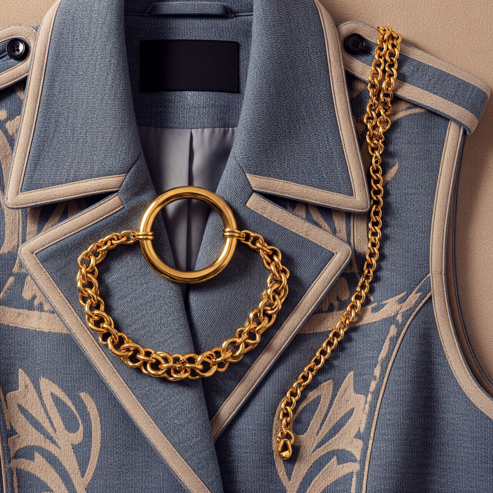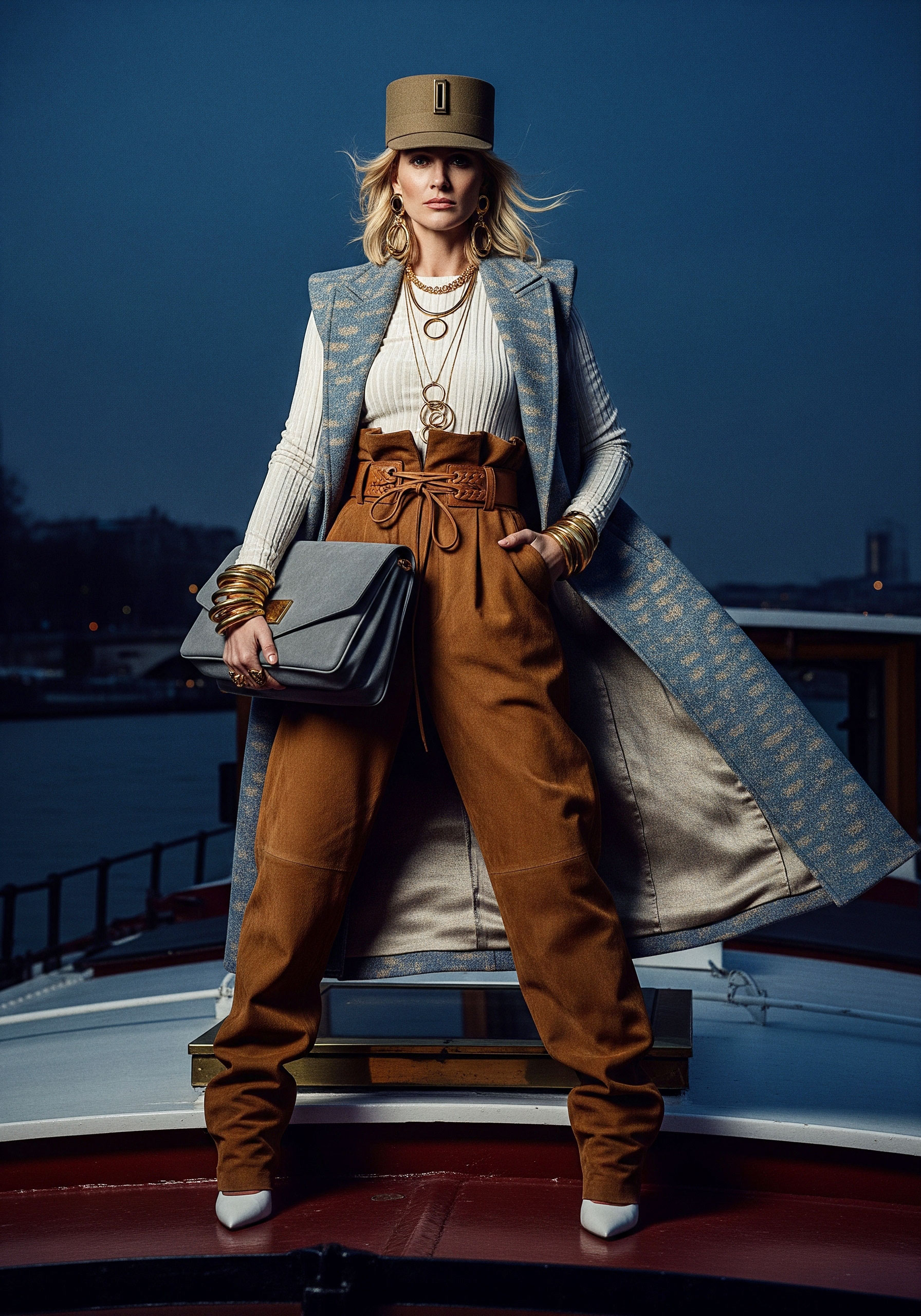 Jewelry completes what fabric begins. It frames, underlines, and refines. The sleeveless coat and kepi reinforce structure, elevating the silhouette into something ceremonial, almost regimental.