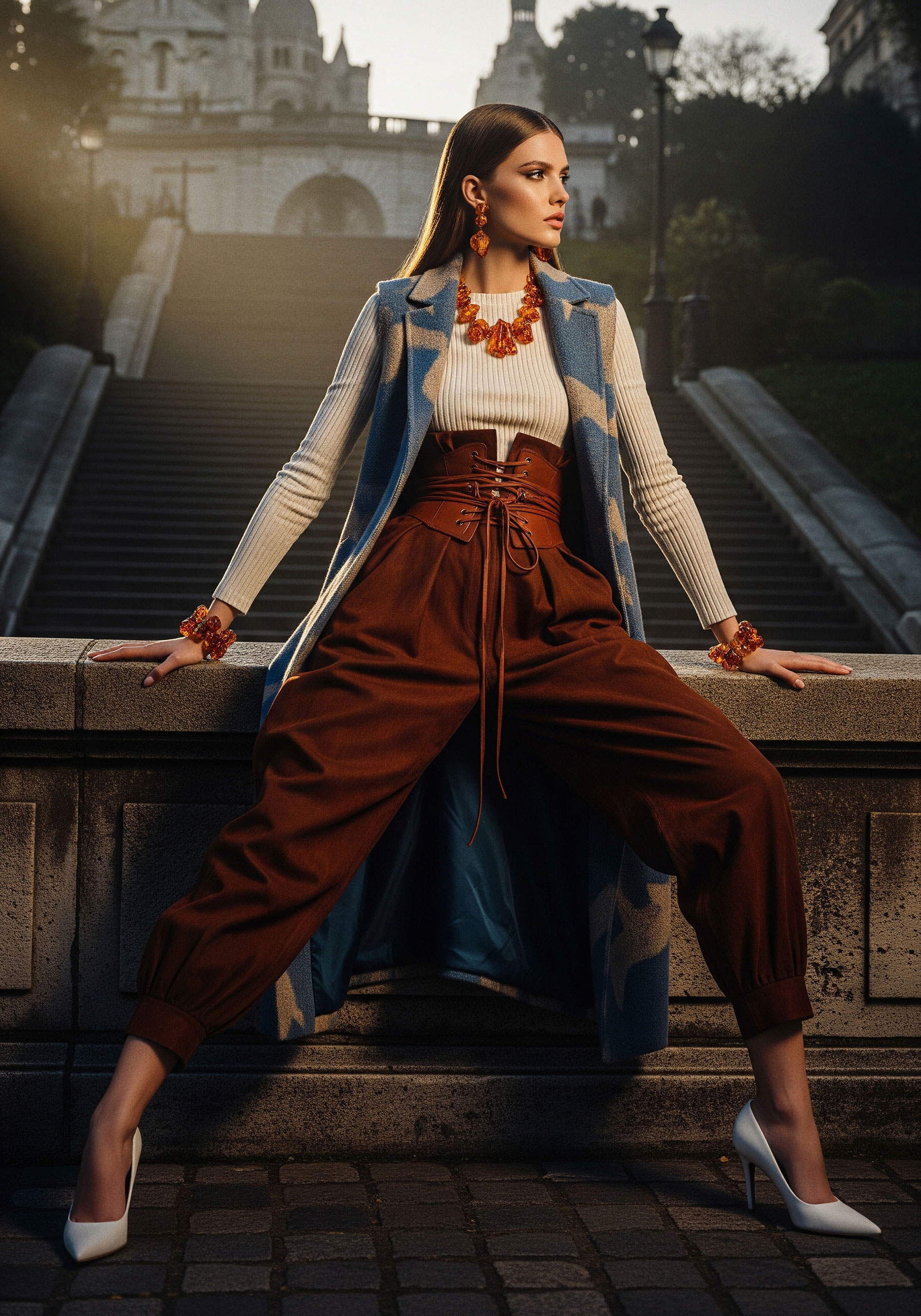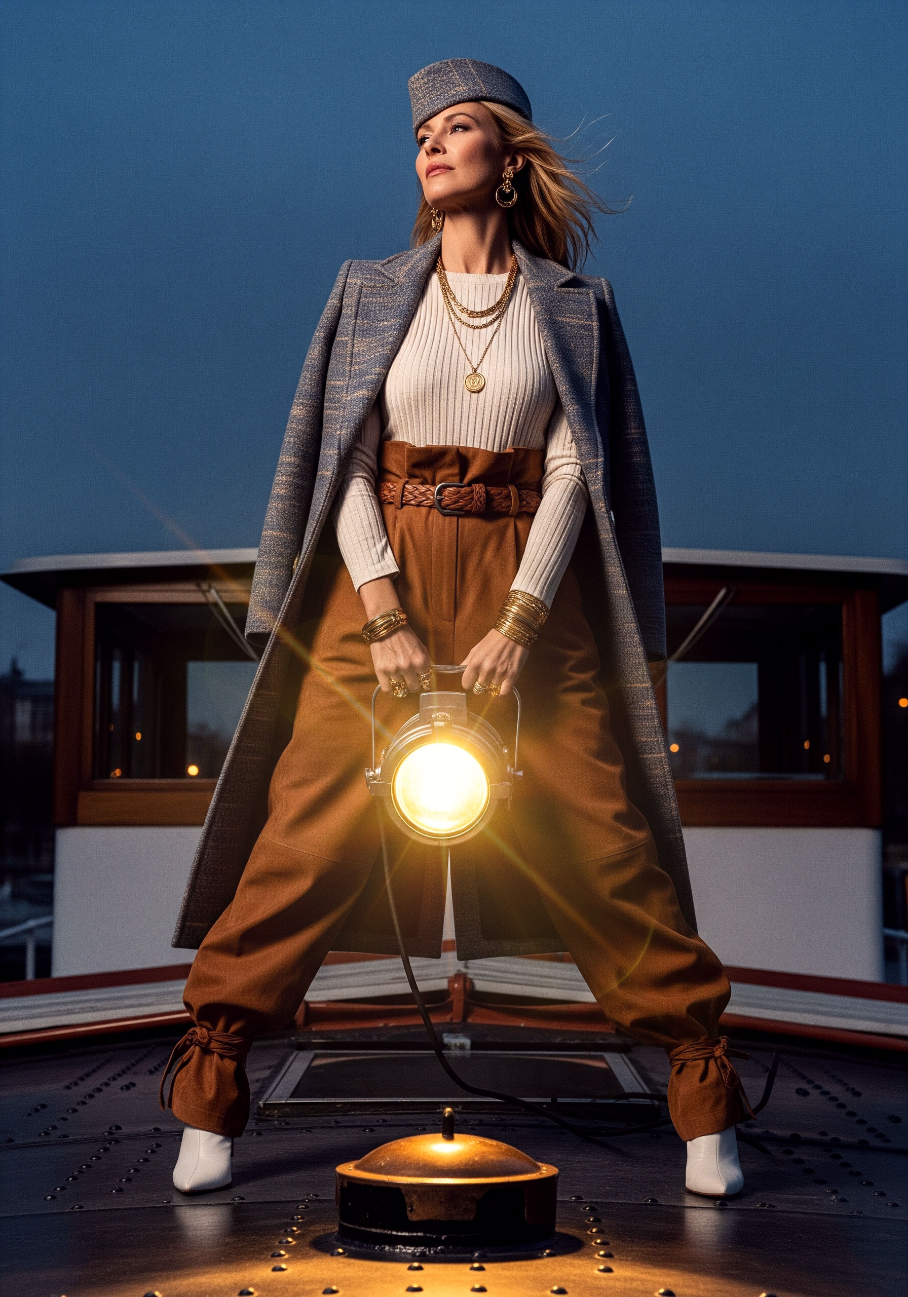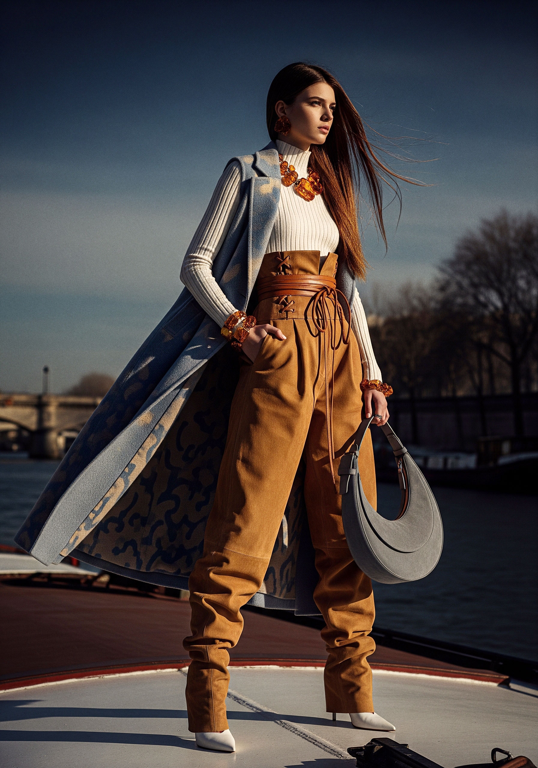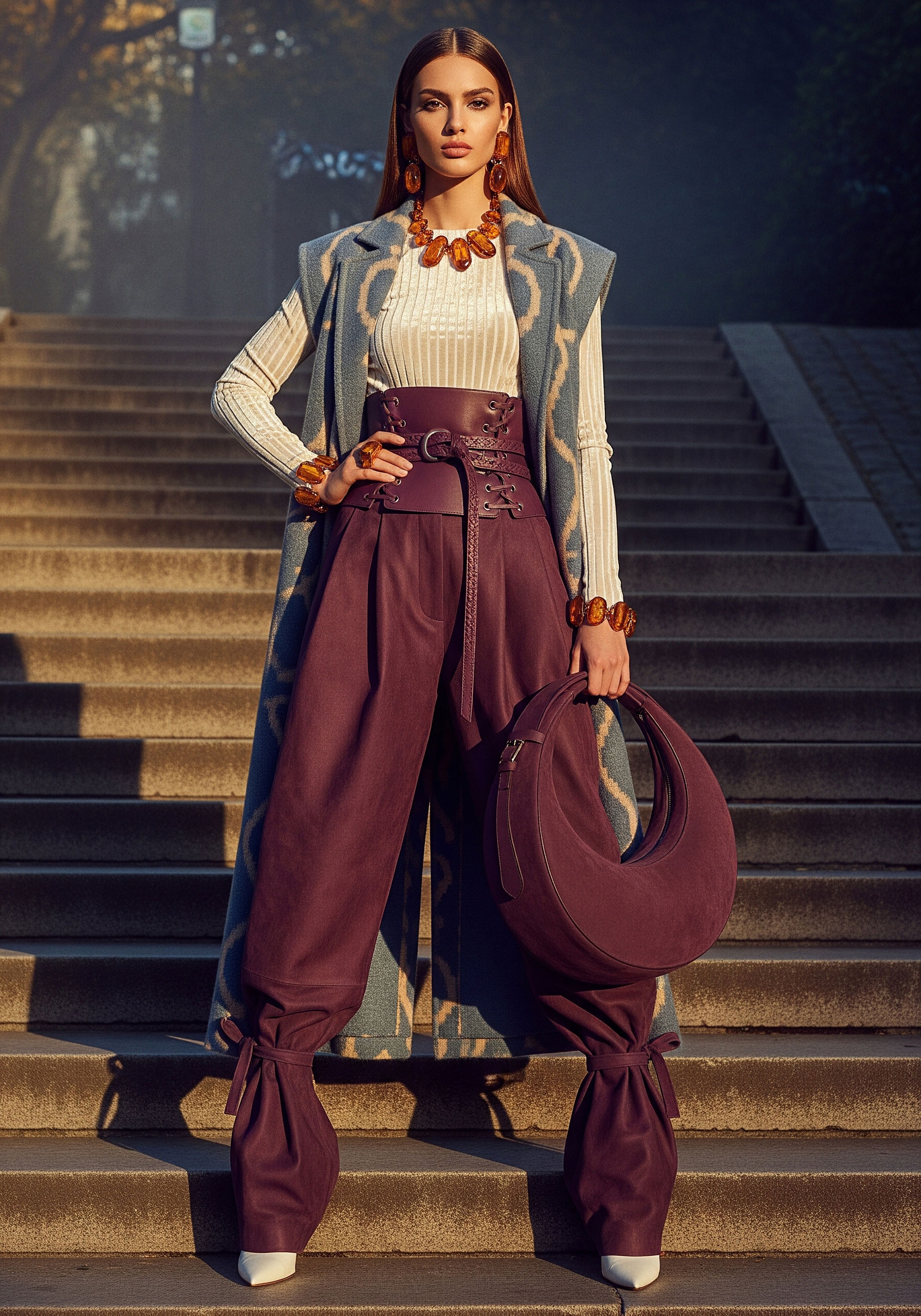 Jewelry completes what fabric begins. It frames, underlines, and refines. The sleeveless coat and kepi reinforce structure, elevating the silhouette into something ceremonial, almost regimental.